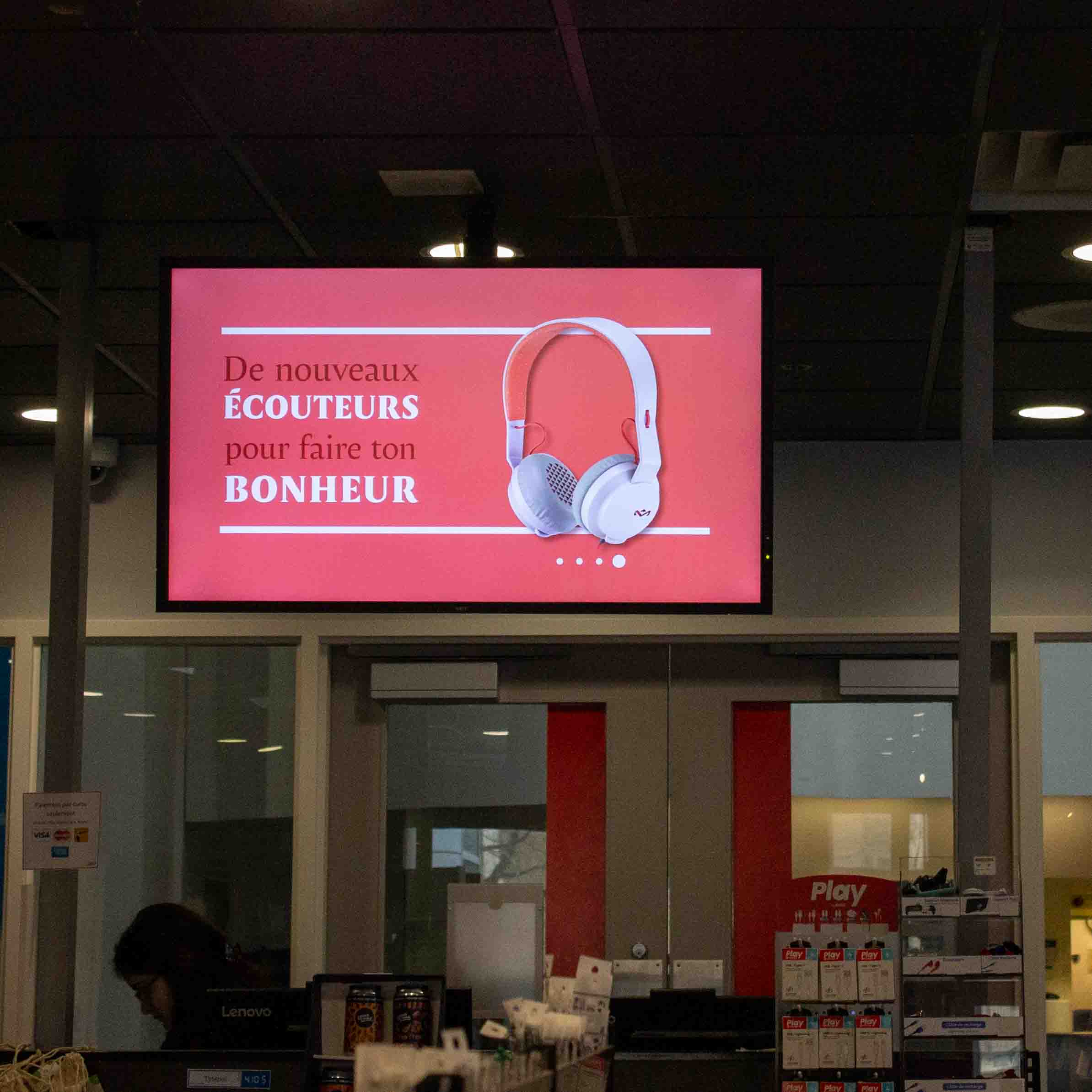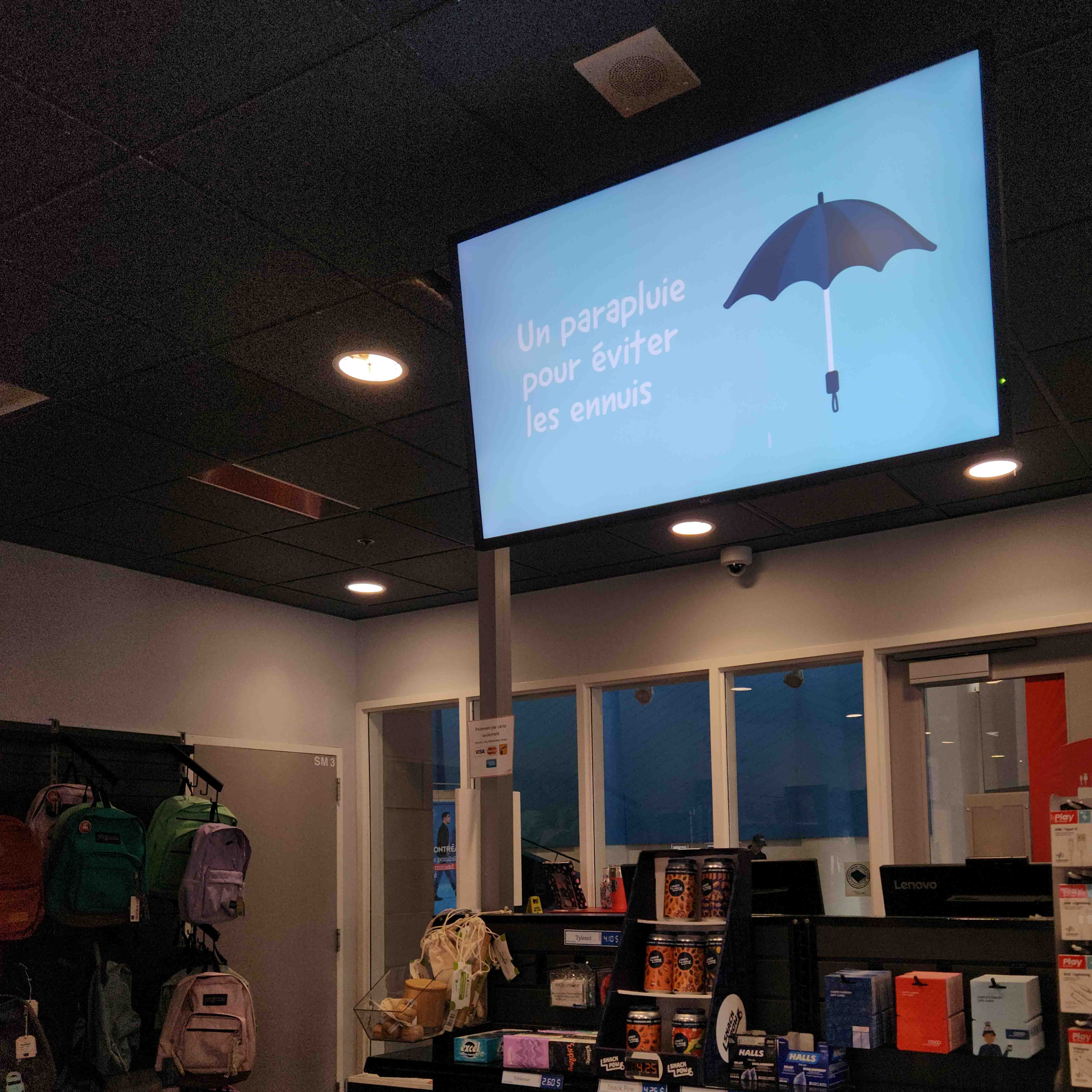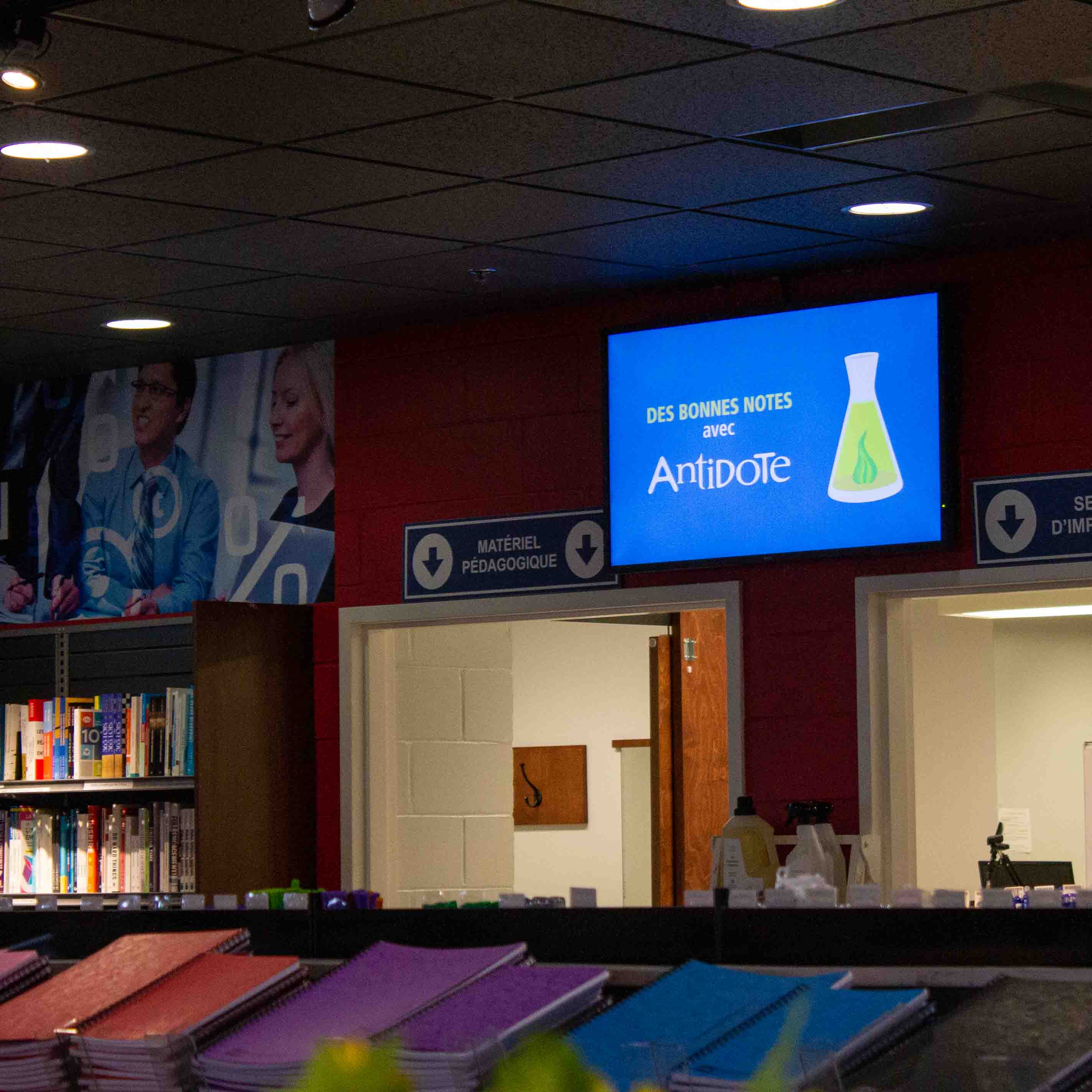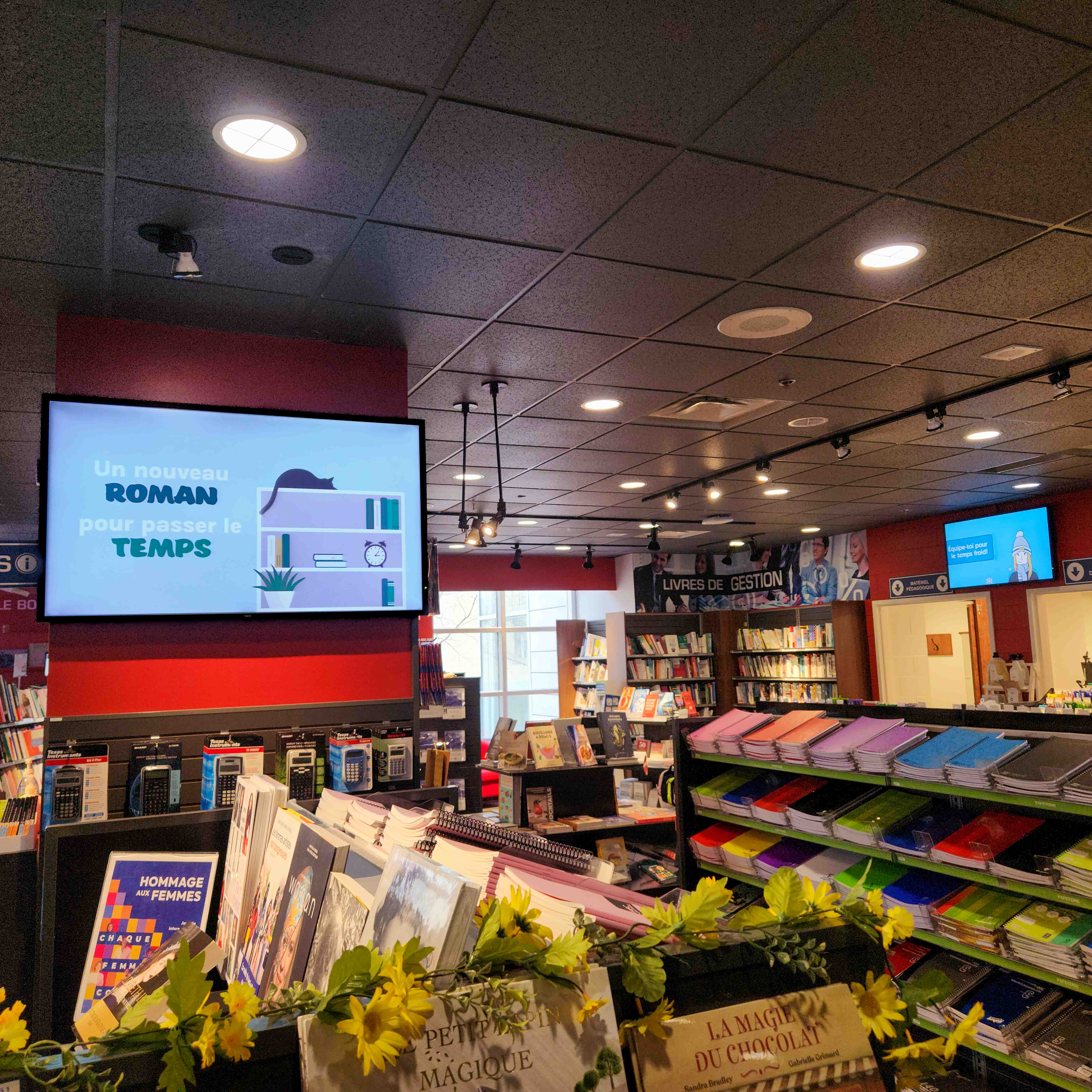 Coop HEC Montréal est responsable des gérer les affichages présents dans les deux boutiques universitaires. Ces visuels présentent les nouveautés ou les promotions en cours.