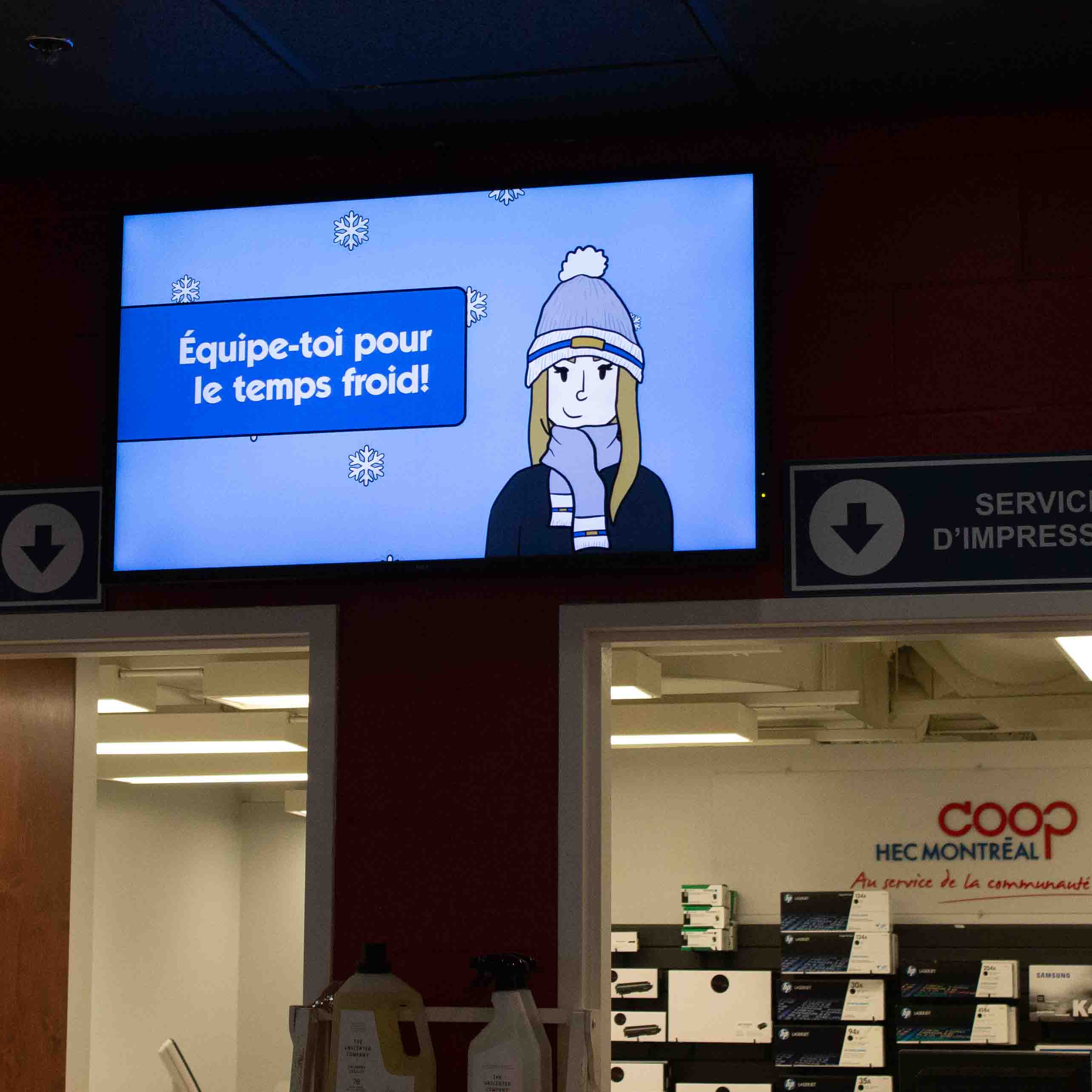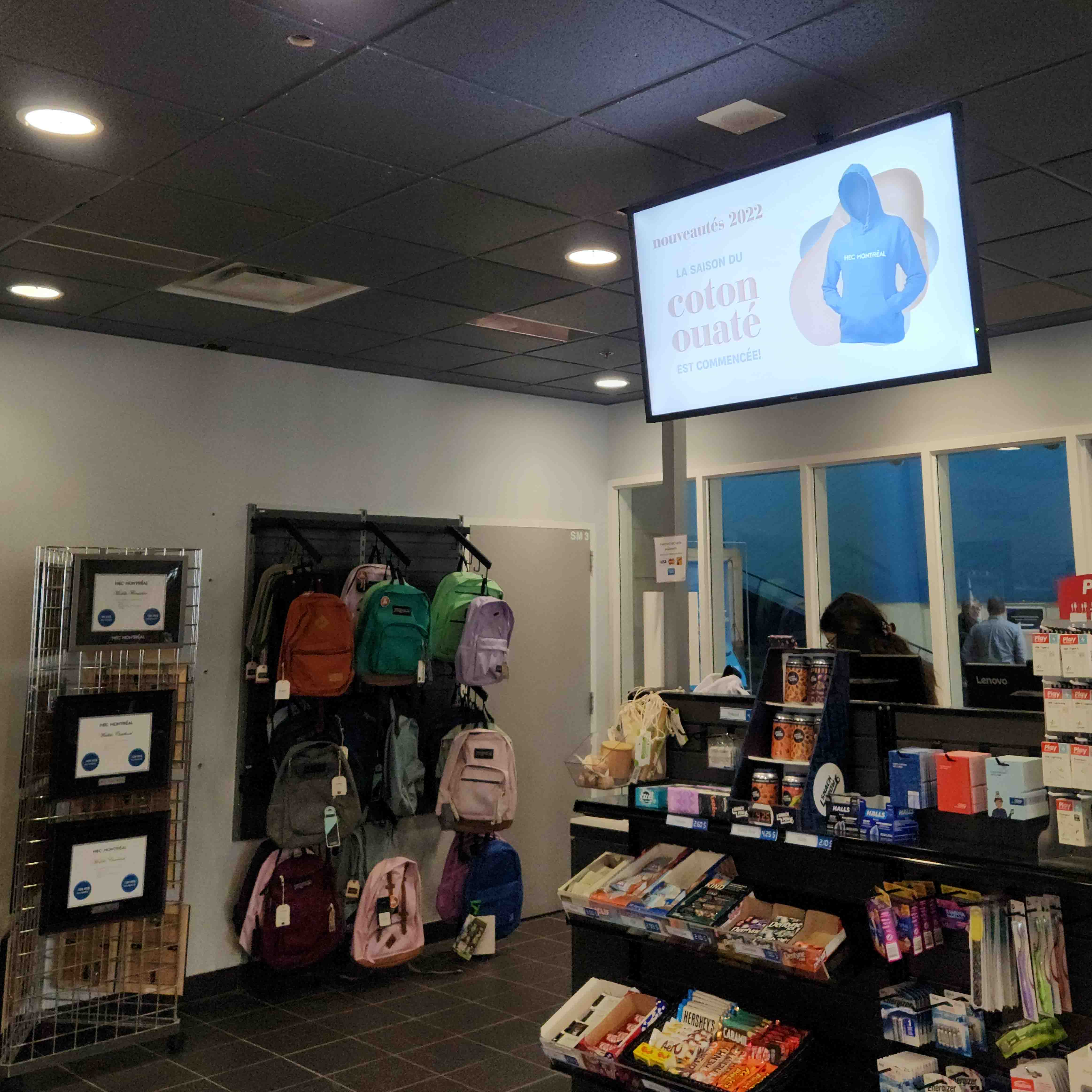 Coop HEC Montréal est responsable des gérer les affichages présents dans les deux boutiques universitaires. Ces visuels présentent les nouveautés ou les promotions en cours.